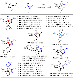 化学学科张泽教授与徐绘博士带领的研究团队,继通过碘与醋酸锰(III)调控性合成2-烃基喹啉及2-酯基喹啉(Org. Chem. Front., 2020, 7, 3368–3373)后,近日在催化剂调控构建多氮杂螺环方面再次取得重要研究进展。该研究团队巧妙设计出烷叉吡唑啉酮与脒的选择性环化反应,并实现了催化剂调控下不同类型吡唑啉酮螺环化合物的选择性合成:(1)在碘代丁二酰亚胺(NIS)及无溶剂机械研磨条件下,单一性形成4,5′-咪唑啉基吡唑啉酮螺环;(2)在溴代丁二酰亚胺(NBS)及甲苯中加热时,则高选择性形成4,4′-咪唑啉基吡唑啉酮螺环。利用该方法分别精准高效合成出28种4,5′-咪唑啉基吡唑啉酮螺环化合物和27种4,4′-咪唑啉基吡唑啉酮螺环化合物。