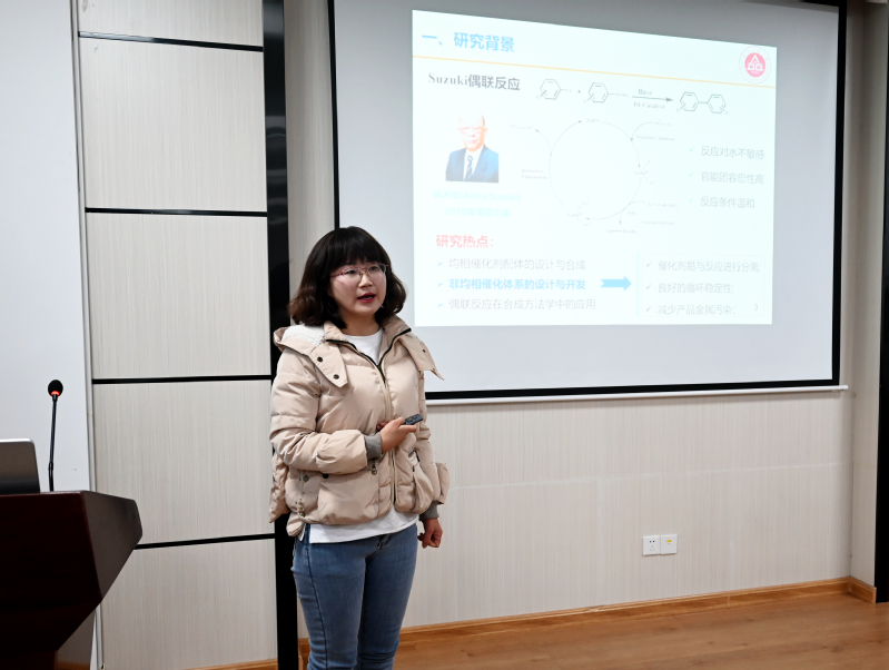 毕佳俊博士毕业于华中科技大学化学与化工学院,主要从事多相催化剂的制备及其应用方面的研究工作。她报告题目为“含N聚合物负载金属催化剂的制备及应用”,报告中分享了她在不同共轭程度以及不同活性中心的催化剂的形貌结构以及催化性能的研究成果,利用X射线衍射仪(XRD)、扫描电镜(SEM)、场发射扫描电镜(TEM)、固体核磁碳谱(13C CP/MAS NMR)和X射线光电子能谱(XPS)等多种表征方法对其物相结构、微观形貌、结构和金属价态进行表征,探讨了上述催化剂在C-C偶联、C-H卤化、酚类降解等反应中的催化活性。
