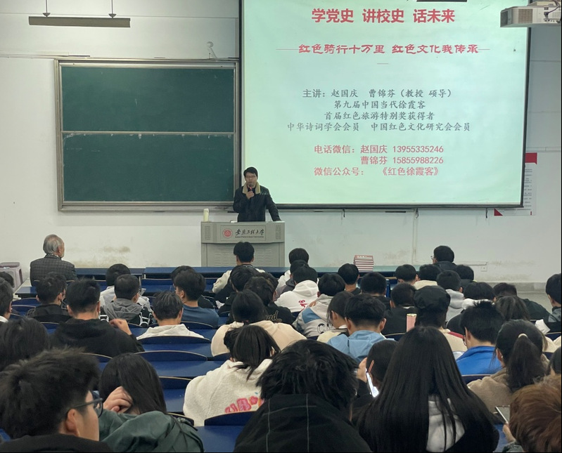 为庆祝中国共产党百年华诞,进一步营造浓厚的党史学习氛围,同时更好地帮助2021级新生尽快完成角色转变,11月25日,化学与环境工程学院邀请第九届“中国当代徐霞客”、首届红色旅游特别奖获得者、《红色骑行十万里》作者赵国庆、曹锦芬教授夫妇,为新生同学作了题为“学党史、讲校史、话未来——红色骑行十万里,红色文化我传承”报告会。化环学院党委书记水心宝主持报告会,2021级新生班级代表参加了本次报告会。