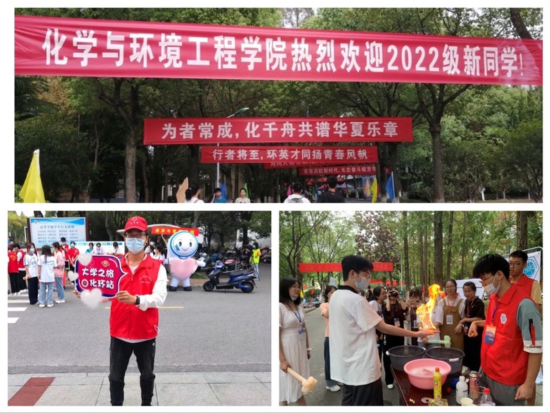 初识化环,和热情撞个满怀。迎新当天,化环学院门口布置一新,路旁插满了彩旗,树上挂好了横幅,老师和志愿者们以高昂的热情和饱满的精神面貌迎接来自全国各地的新生。穿着红色小马甲的志愿者不停地穿梭在报到点、校门口和宿舍之间,他们把一批批新生迎进来又送到宿舍。学院精心安排“火焰掌”“大象牙膏”“化学红绿灯”“水中沙和消失的水”“小桔灯和彩虹雨”等趣味化学实验,学长学姐进行现场讲解,吸引新生自己前来动手操作,体验化学实验的奥秘,培养新生对专业的兴趣和热爱,展示学院特色。同时设置学生党员示范岗,组建党员志愿服务小分队,发挥党员的战斗堡垒和先锋模范带头作用,帮助新生搬运行李,贴心服务。热情的服务和热烈的氛围给同学们留下了深刻印象。