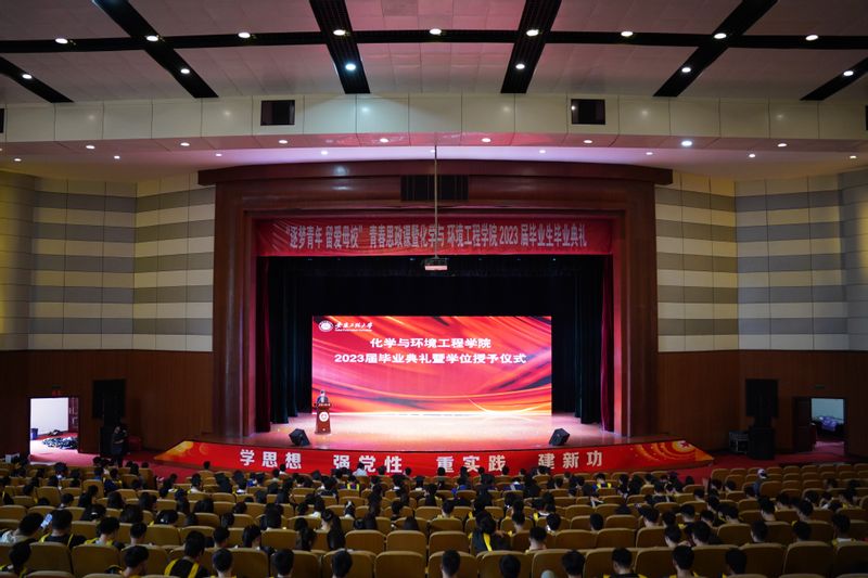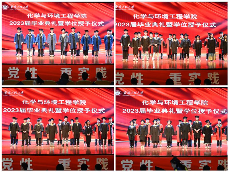 五月榴花照眼明,枝间时见子初成。5月27日下午,化学与环境工程学院2023届毕业典礼暨学位授予仪式在师生活动中心大礼堂隆重举行。校党委副书记苏国红、江苏蓝必胜化工环保股份有限公司副总经理徐林兰,蓝必盛工程经理黎飞虎,应化02级校友、苏州大学特聘教授、博士生导师程亮,安徽卫生健康职业学院医学系副主任余晨辉,学生处副处长郭全根,校团委副书记李恒奎,宣传部副部长王燕,化环学院党政领导出席活动。学院各系部主任、全体辅导员、兼职辅导员、班主任、教师代表和2023全体届毕业生和各年级学生代表参加典礼。毕业典礼由学院党委副书记胡承功主持。