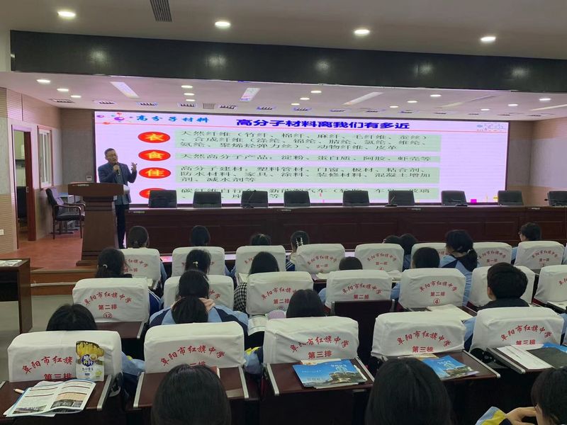 在阜阳红旗中学,张宗瑞以“高分子材料助推新能源汽车创新发展”为题开展科普宣讲。他以生活中常见物品为引阐述高分子材料就在我们身边,进而对新能源汽车这一蓬勃发展的产业进行解读。向同学们详细介绍新能源汽车中涉及的高分子材料有哪些,系统解读高分子材料工艺对于新能源汽车的发展的重要推动作用。引发了同学们对新兴事物积极探索的热情,让同学们感受到了高分子材料科学的现状和基础知识学习的必要性。