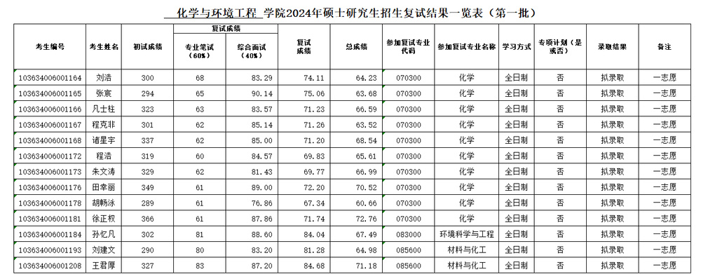 化学与环境工程学院2024年硕士研究生招生复试结果一览表(一志愿)