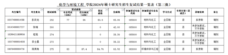 化学与环境工程学院2024年硕士研究生招生复试结果一览表(调剂第三批)