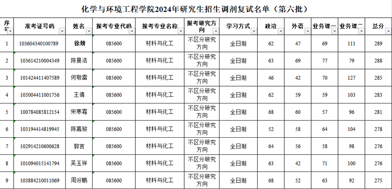 化学与环境工程学院2024年研究生招生调剂复试名单(第六批)