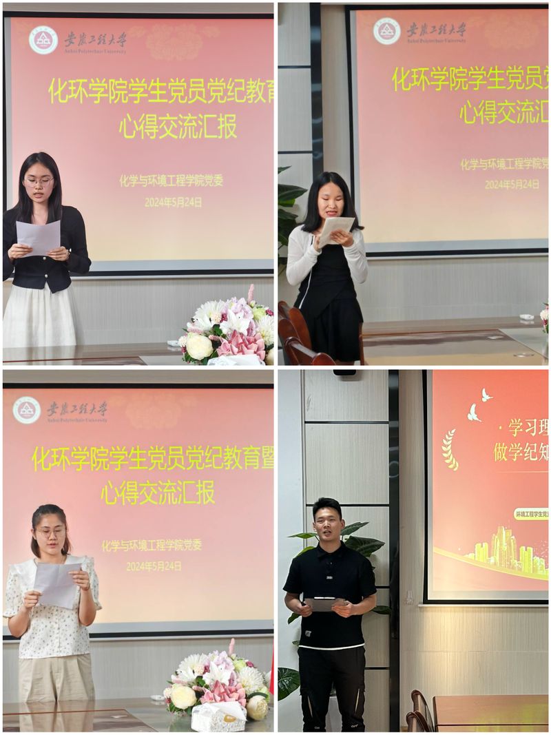 学院应化系学生第一党支部、化工系学生党支部、高分子系学生党支部、环工系学生党支部、研究生党支部等12名党员代表做党纪学习教育心得体会分享。高分子系学生党支部田心雨同志说到:“我深刻意识到了修订《条例》的重要意义,重点学习了习近平总书记关于党纪学习教育的重要讲话和指示精神,学习新修订的中国共产党纪律处分条例,明确了如何遵守党纪,坚守底线,不越红线,做一个合格的党员。”环工系学生党支部高鑫程同志说到:“通过对党纪的学习,我深刻地感受到中国共产党员的纯洁性和先锋性,党员干部要坚持学习党的先进思想和方针政策,用先进的理论武装头脑、指导实践。要强化理想信念,打好信仰之基,积极主动学习党章党规党纪,坚守纪律规矩,随时随地严格要求自己,保持道德定力和政治定力。”化工系学生党支部余爱建说到:“通过学习《中国共产党纪律处分条例》,我深刻理解体会到了党要管党、全面从严治党的鲜明立场,通过这次学习,我进一步增强了党性修养,明确了纪律规矩,坚定了理想信念。作为一名学生党员,更应起到带头作用,正确体会和把握精神的实质,自觉在学习上、生活上、工作上处处发挥作用,展现大学生党员本色。”