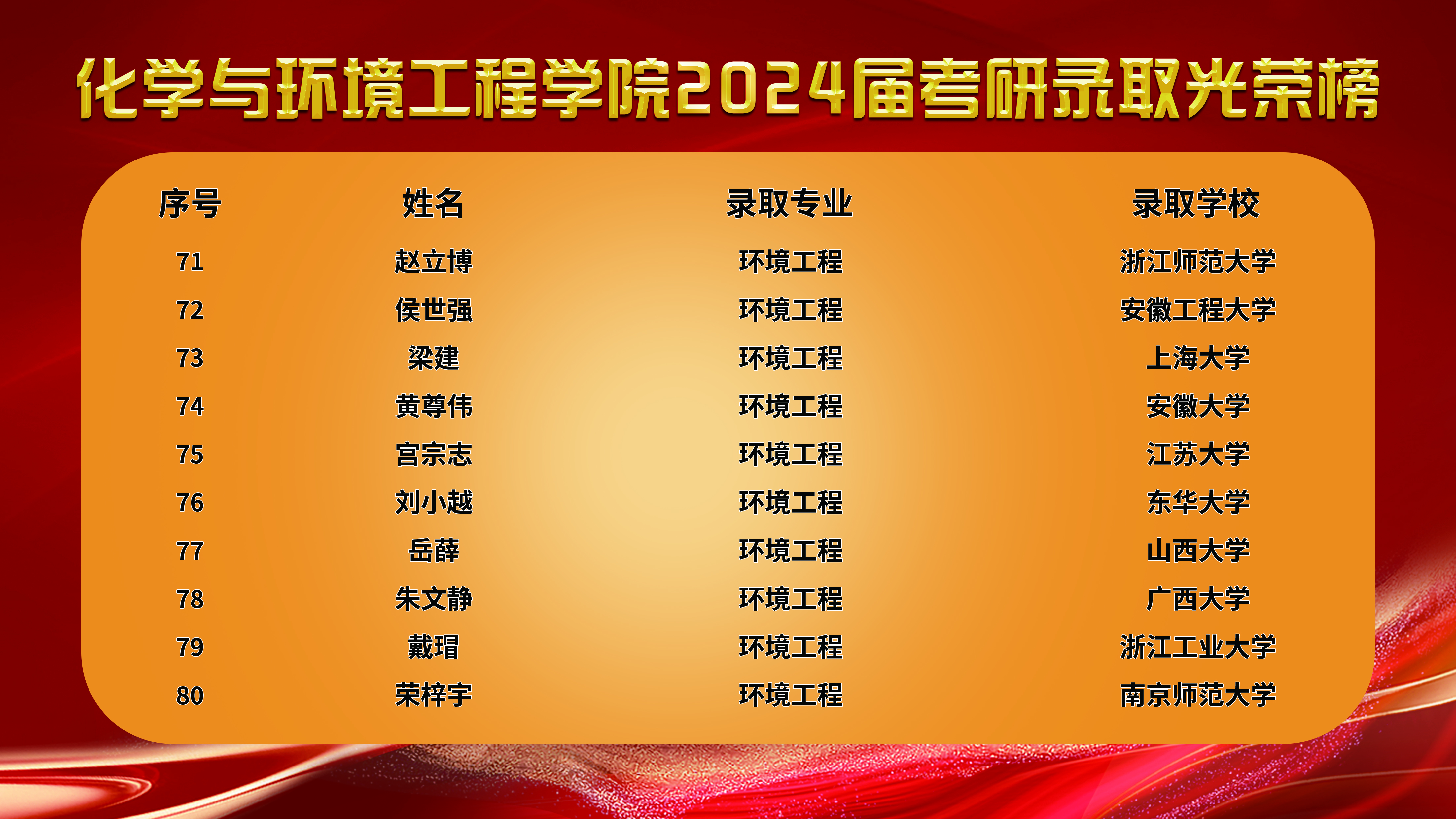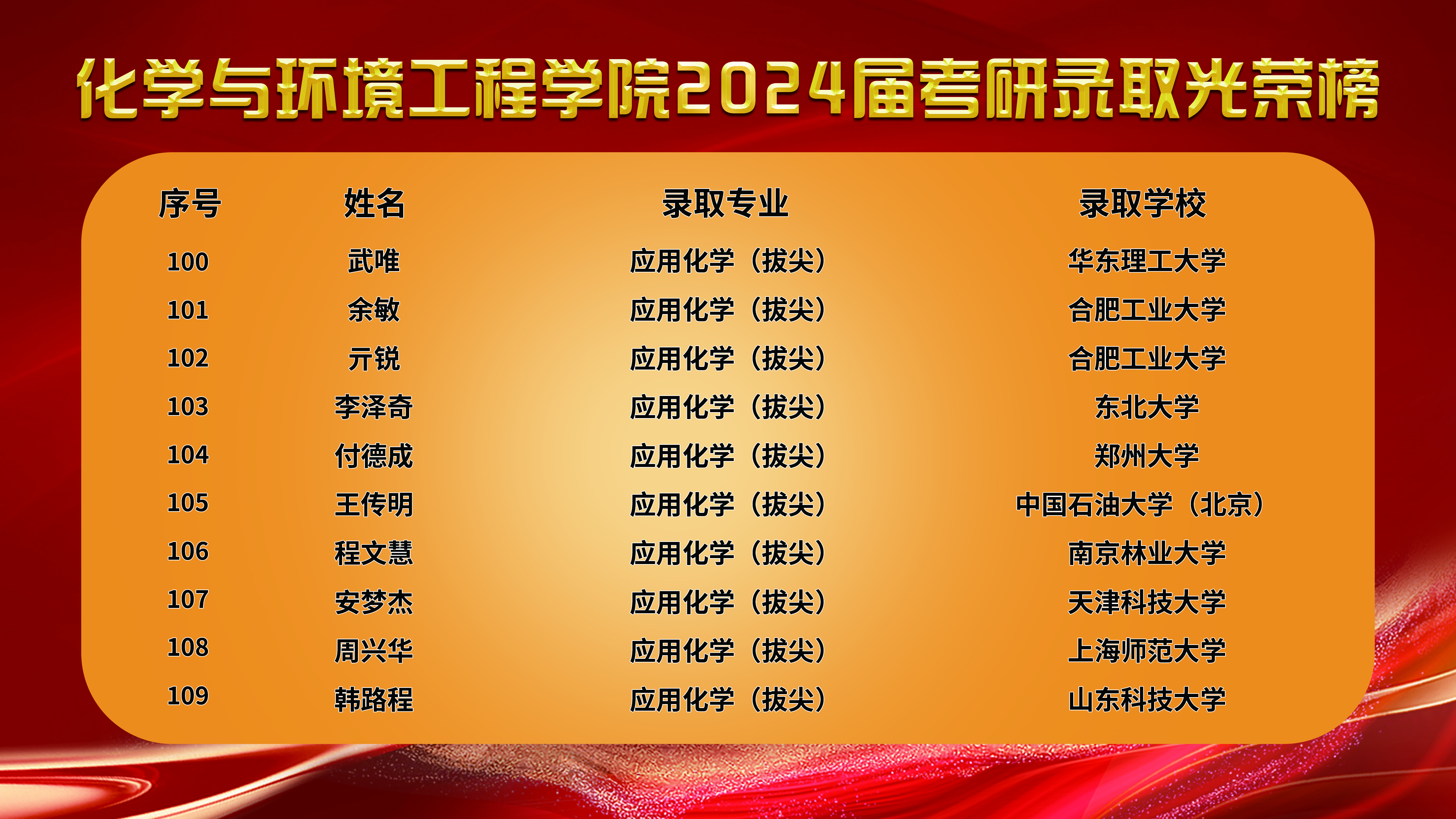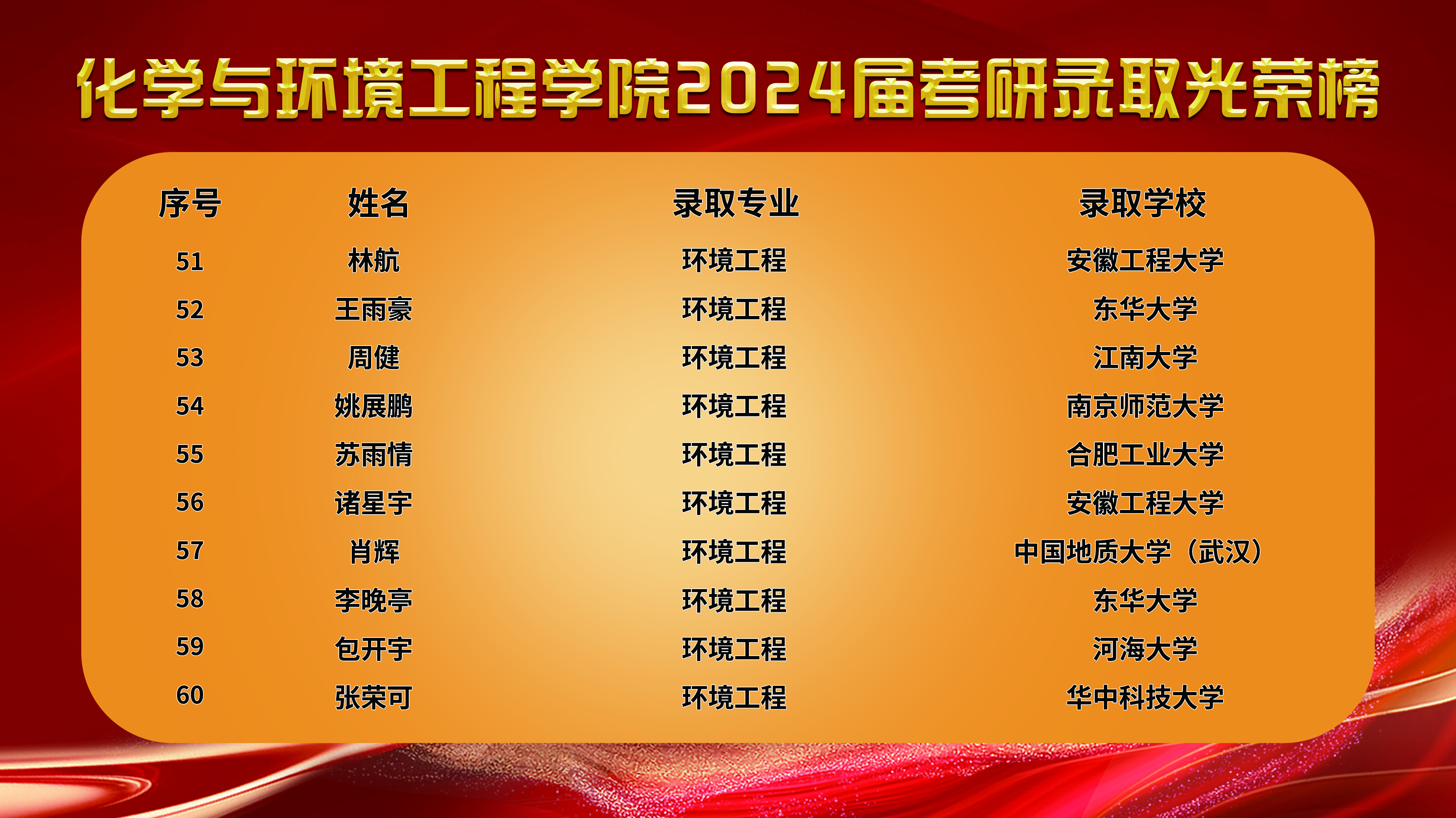 化学与环境工程学院在考研工作中所取得的成绩,是在学校党委行政的正确指导下,全院师生共同努力的结果。未来,我们将继续以考研为抓手,不断推进学风建设,提升教育教学质量,推动毕业生就业高质量发展。