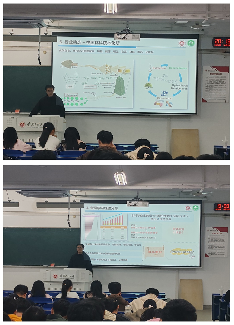 活动第二环节由学院2016级应用化学专业校友、中国林业科学研究院林产化学工业研究所在读博士研究生刘勇展开分享交流。他从个人经历出发,与同学们分享了在专业学习、考研、学生干部工作等不同层面的扎实经验,并着眼未来,分析了行业动态、就业形势及研究生生活体验。他呼吁同学们珍惜时间,爱惜身体,自主学习,终身学习。