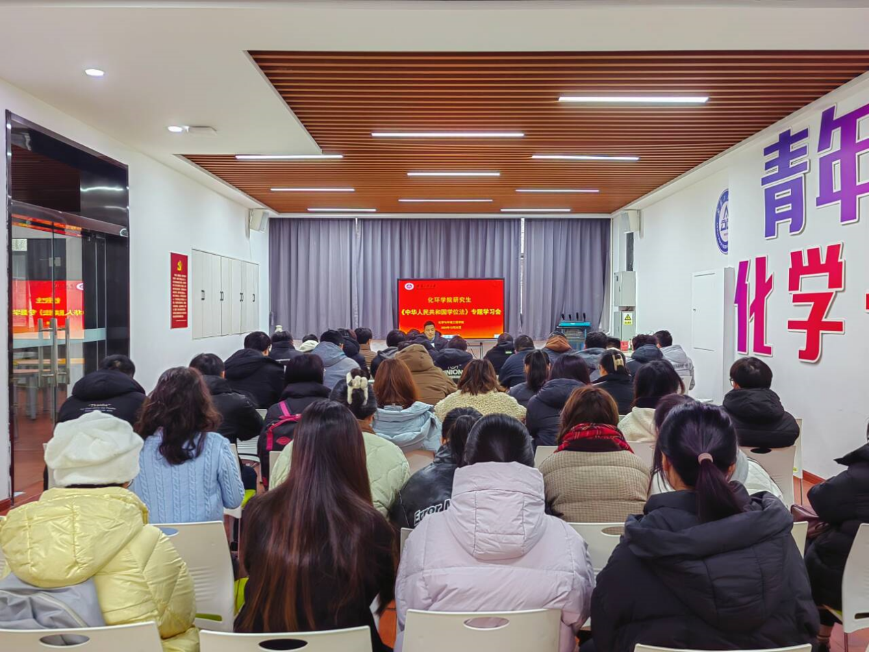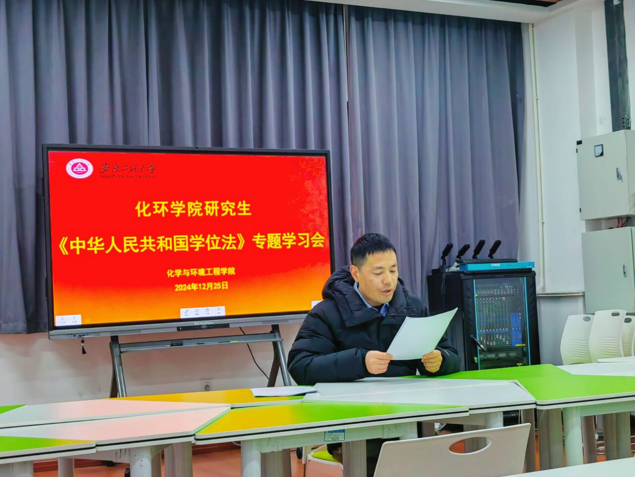 为深入贯彻落实学位相关法律法规,强化师生的学位意识和法律观念,化学与环境工程学院于12月25日组织开展了《中华人民共和国学位法》专题学习活动。学院副院长徐大勇出席并担任领学人,全院研究生共同参与此次学习。