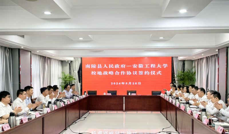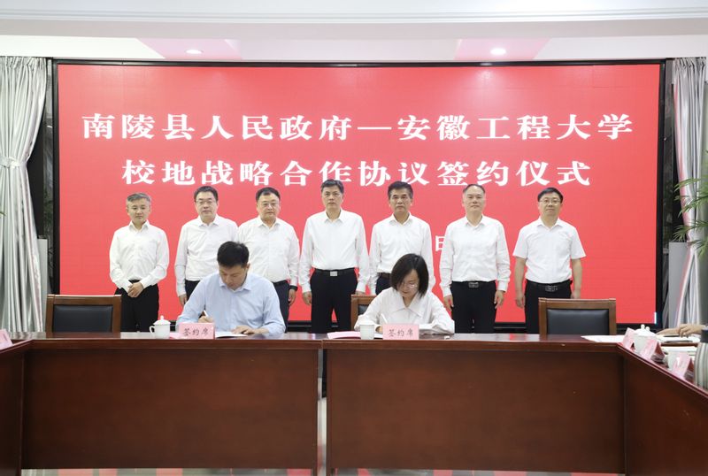 5月20日,校党委书记张志宏带队赴南陵县人民政府签订战略合作协议。校党委副书记、校长卢平,校党委常委、副校长凤权,南陵县县委书记李新宇,县委副书记、县长强健,县委常委、常务副县长潘吉平,县委常委、组织部部长王旸,县政府副县长俞悦,南陵县有关部门负责人、学校相关职能部门、学院主要负责人参加。签约仪式由王旸主持。