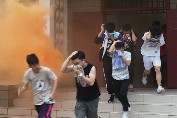 演练之前,2017级辅导员蒋书云给大家详细介绍了应急避震演练和紧急疏散演练两个环节的流程及注意事项,并要求大家端正态度,积极参与到演练中。下午5点整,随着一声清脆的哨响,演练正式开始。在引导员的指示下,同学们立即用双手或书本保护好头部,迅速躲避在书桌下或内墙角进行应急避震;避震演练结束后,在疏导员的指挥下,同学们按照演练要求从宿舍撤离。整个演练过程秩序井然,为了帮助大家体验火灾现场,工作人员还在宿舍楼门口放置了烟雾弹,现场浓烟滚滚,同学们纷纷捂住口鼻,护住头部,快速有序的撤离到了指定位置。