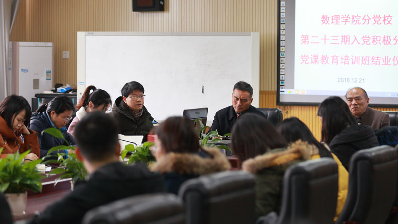 12月21日下午,数理学院分党校第二十三期入党积极分子培训班结业典礼在学院学术交流室举行。数理学院党委书记周毅仁、院长费为银、党委副书记水心宝、组织员郭亚勤、团委副书记苏燕南、学生党支部书记、全体辅导员及本期培训班学员参加了典礼。典礼由培训班班主任蒋书云主持。