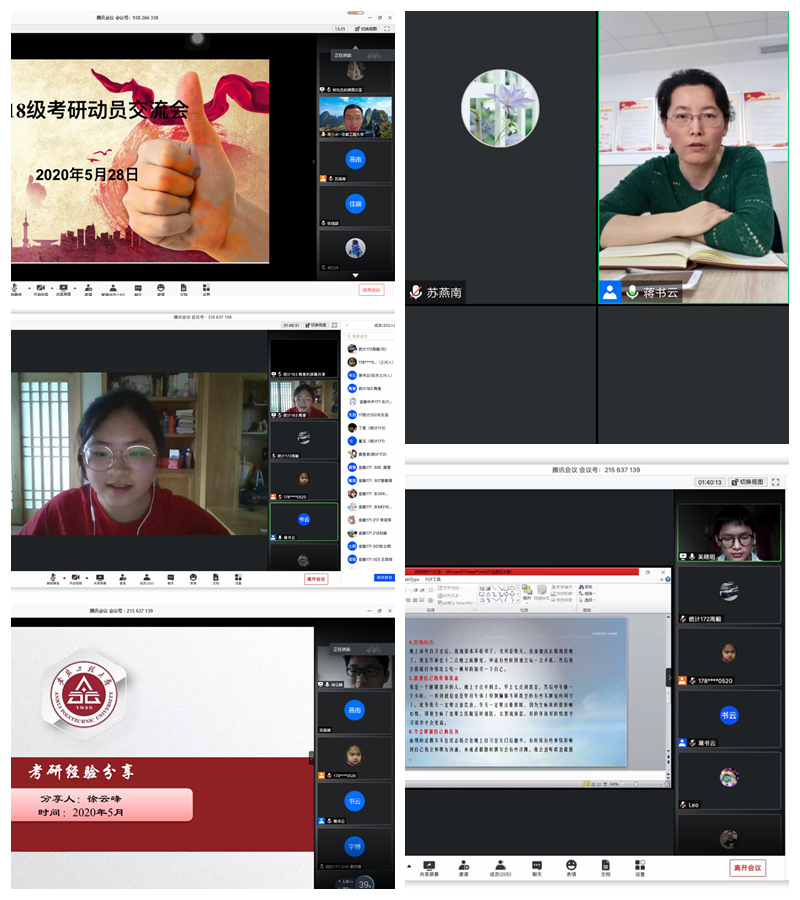 5月27日-28日,数理学院分批次召开2020年考研经验交流会,交流会以腾讯会议方式在线进行。数理学院副院长吴小太、统计学系主任张玥、金融工程系主任潘海峰、全体辅导员、2016级考研优秀学生代表及17、18级全体同学参加会议。