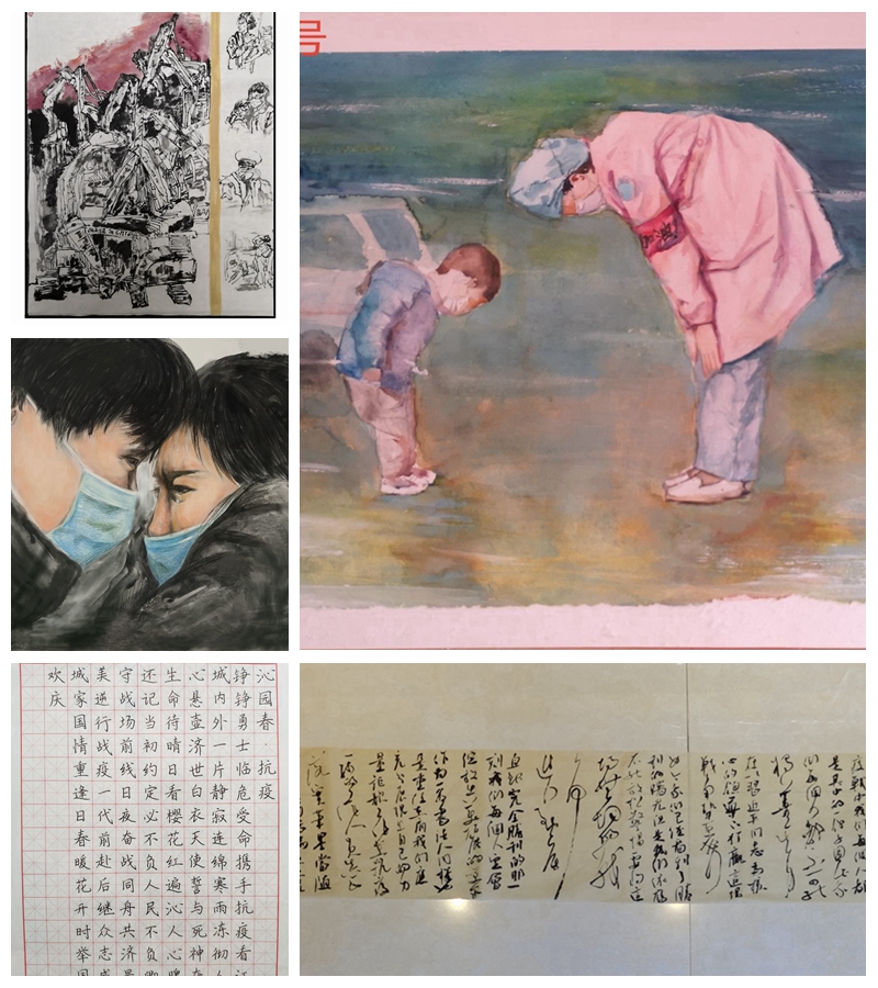 本次大赛分为初赛和决赛两部分,均采用“线下创作+线上评比”的模式进行.比赛自四月初启动,共收到近500名同学精心创作的书画作品,经评选30名同学进入决赛。参赛作品中有以火神山雷神山的建造场景为题材进行的创作,也有孩子和医护人员相互鞠躬的温暖瞬间,体现疫情之下国难当头,全国人民团结一心共渡难关的精神状态,感恩与温暖的人间印记。经过激烈的角逐,最终陈晨、汪陈诺、张方静分别获得硬笔组、软笔组、绘画组一等奖,雷聚国等6名同学获得二等奖,汪炜桀等9名同学获得三等奖。