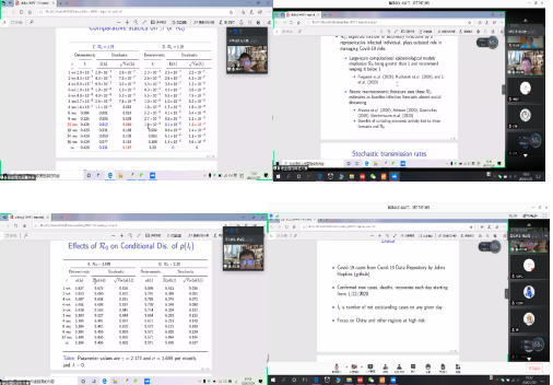 杨金强教授的报告主题为《Implications of Stochastic Transmission Shocks for Managing Pandemic Risks》。杨教授以随机金融的思想构建了传染病控制模型,模拟分析了不同情境下新冠疫情的感染人数,并就新冠疫情对资产定价模型的影响做了详细解读。杨金强教授精彩的报告为我们师生的建模方式提供了新思路。杨教授的报告结束后,与会师生也就模型的建立细节进行了深入交流,使全体师生受益匪浅。