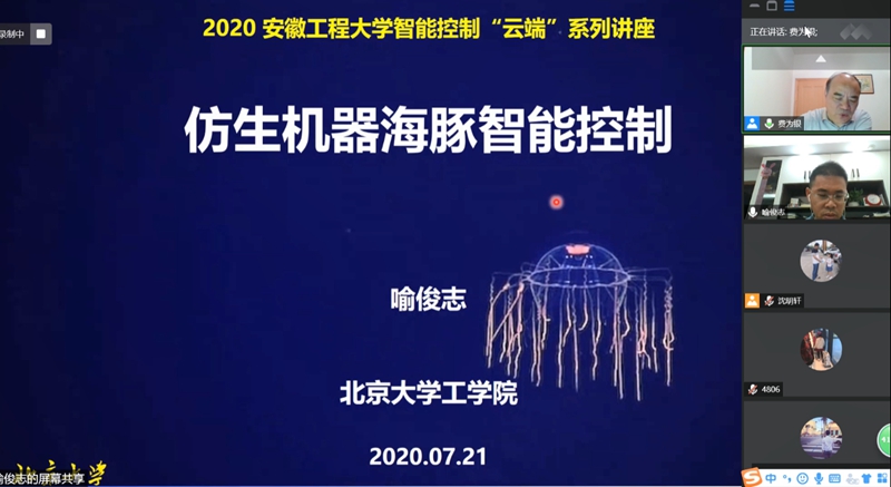 喻俊志教授做了《仿生机器海豚智能控制》的学术报告,他从海洋强国战略的角度出发介绍了开发海洋机器人的意义,并对仿生机器海豚智能控制的思路以及跃水机器海豚的仿生原型、具体结构和基本参数进行了分析。他还对他在定深运动控制、定向运动控制、平面路径控制及跃水运动控制等智能运动控制方面所做的工作进行了介绍。