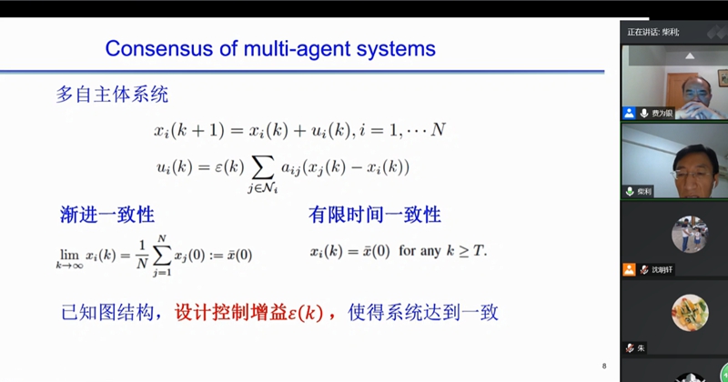 7月21日,柴利教授做了题为《多智能体系统平均一致性分析与综合的图滤波方法》的报告,他在报告中介绍了多智能体在现实世界中的应用、常用的多智能体模型以及现有模型存在的不足。并且对如何通过建立图拓扑结构、控制增益与收敛率之间的直接关系函数研究一致性问题进行了详细的分析。