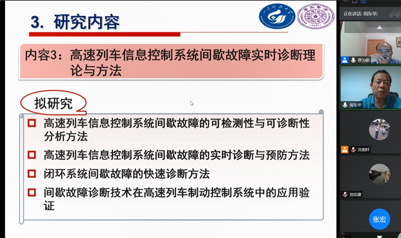 7月24日,周东华教授做了题为《高速列车制动系统实时故障诊断技术》的学术报告,他针对高速列车制动系统实时故障诊断技术科学问题提出了五个研究内容,并重点介绍了高速列车信息控制系统制动系统间歇故障实时诊断的理论和方法。