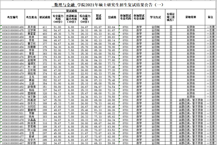 数理与金融 学院2021年硕士研究生招生复试结果公告(一)
