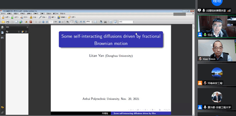 闫理坦教授作了题为《Some self-interacting diffusions driven by fractional Brownian motion》的报告,考虑了由分数布朗运动驱动的一类随机微分方程的自交互扩散问题,回顾了此类方程的研究背景,并且给出了其主要结果,包括研究了线性交互、带有紧支持的有界交互、持续交互等。