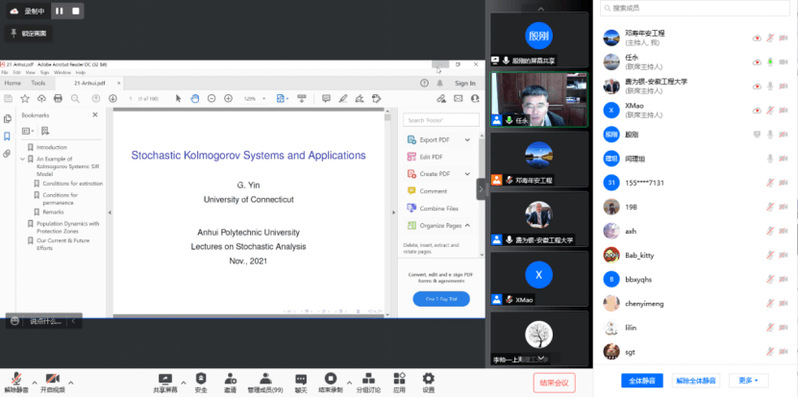 11月20日,数理与金融学院在线上举办了“随机分析”专题报告会,会议邀请了美国密歇根州立大学肖益民教授、东华大学闫理坦教授、美国康涅狄格大学殷刚教授作了专题报告。校党委常委、副校长费为银教授出席了报告会,会议由安徽师范大学党委常委、副校长任永教授主持,英国思克莱德大学毛学荣教授、数理与金融学院部分教师和研究生聆听了此次报告。