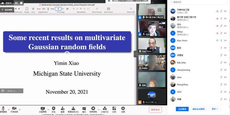 肖益民教授作了题为《Some recent results on multivariate Gaussian random fields》的报告,介绍了一大类具有平稳增量的多元高斯随机场的概率和统计性质的一些最新结果,包括算子分数布朗运动、向量值算子缩放随机场和矩阵值高斯随机场。一些有趣的问题包括描述坐标过程之间的依赖结构,以及研究这些依赖结构对多元高斯随机场的概率和统计特性的影响。