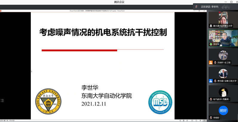 11日下午的报告会由北京理工大学自动化学院院长夏元清教授、上海理工大学魏国亮教授和东华大学信息科学与技术学院副院长沈波教授主持。中国科学院自动化研究所程龙研究员通过《手康复机器人设计、感知与控制》的报告介绍了面向手功能康复机器人的研究背景和研究现状及其课题组在手部机器人系统设计、主被动控制方法等方面开展的工作。东南大学自动化学院副院长李世华教授利用《考虑噪声情况的机电系统抗干扰控制》的报告,讨论了由于量测噪声影响下的机电系统抗干扰控制问题,给出了这方面的一些最新理论成果以及在汽车发动机电控系统的验证结果应用。浙江大学工业技术转化研究院副院长赵春晖教授分享了题为《零样本工业设备故障诊断研究》,介绍了零样本学习理论并通过建立零样本故障诊断迁移方法,解决了故障诊断对样本量约束难以满足的瓶颈问题。广西大学陈武华教授则通过《Sliding Mode Control for Linear Uncertain Systems With Impulse Effects via Switching Gains》的报告讨论了具有脉冲效应的线性不确定系统的滑模控制问题的解决方法。山东师范大学牛奔教授以《Global adaptive control of switched uncertain nonlinear systems: An improved MDADT method》为题,讨论如何以平均驻留时间方法研究切换不确定非线性系统的全局自适应控制问题。曲阜师范大学刘亮教授在《随机前馈非线性系统控制》报告中讲述了随机前馈非线性系统基于齐次占优方法和参数依赖方法的控制问题。