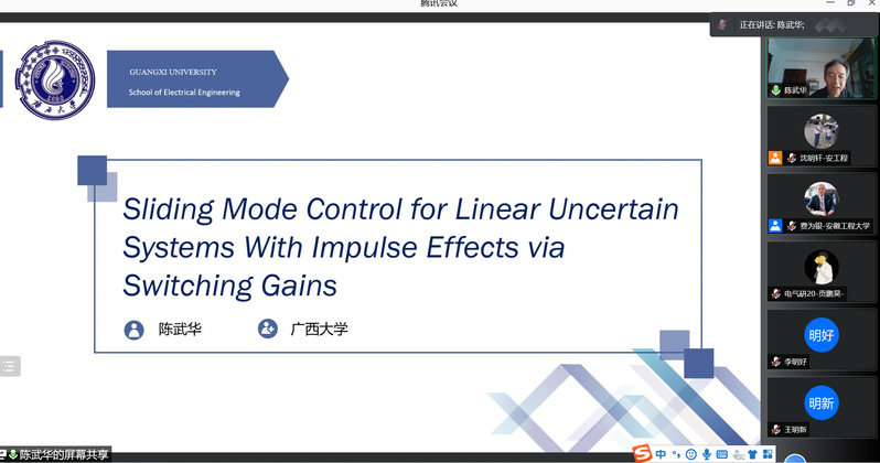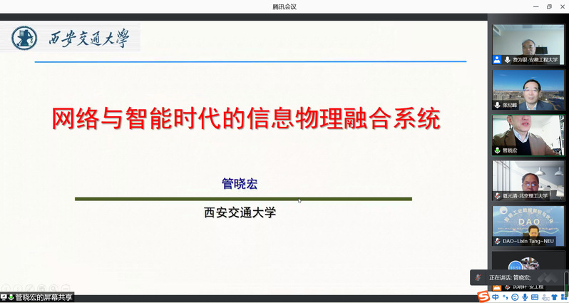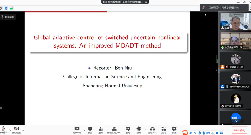 本次线上学术研讨会从11日上午8点50开始到晚上9点结束,有14位报告人作了精彩报告,带来了国内外最新的研究成果。11日上午的报告由中国科学院数学与系统科学研究院系统所张纪峰研究员和华中科技大学关治洪教授主持。中国科学院院士、西安交通大学管晓宏教授作了《网络与智能时代的信息物理融合系统》的报告,介绍了智能时代的大环境下,信息物理融合系统在制造、能源、交通及航空航天等领域的重大应用。中国工程院院士、东北大学副校长唐立新教授作了题为《Data analytics and optimization for smart industry》的报告,详细介绍了钢铁生产行业中生产、能源、数据以及物流系统模型和优化方法。山东大学刘允刚教授以《Adaptive finite-time stabilization witharbitrarily prescribed settling-time》为题介绍了不确定非线性系统自适应定时控制方法。华东理工大学牛玉刚教授则通过《Markov跳变系统/切换系统的同步和异步控制》的报告介绍了Markov跳变系统和切换系统等多模态系统控制设计与应用中的同步和异步问题。