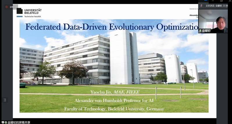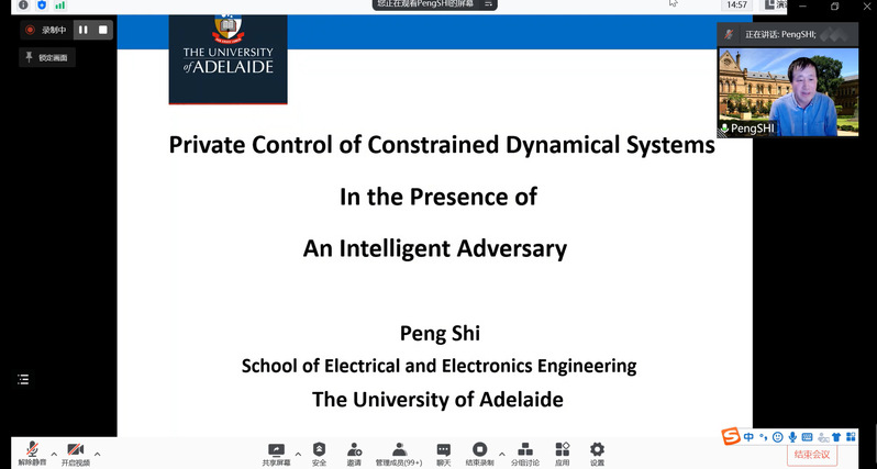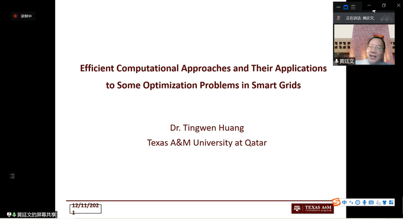 11日晚上的报告会由东北石油大学副校长董宏丽教授和英国布鲁奈尔大学终身教授王子栋教授主持。欧洲科学院院士、澳大利亚阿德莱德大学石碰教授分享了《Private Control of Constrained Dynamical Systems in the Presence of An Intelligent Adversary》,从无人机监控、植入式医疗设备和虚拟现实耳机加密出发,设计出了保持设备私有性的控制算法,并给出了保证控制系统的稳定性标准。欧洲科学院院士、澳大利亚斯威本科技大学副校长韩清龙教授作了题为《Distributed Control and Optimization for Networked Microgrids: A Multi-Agent System- Based Approach》的报告,介绍了一种基于多智能体系统的策略以及交流微电网中的分布式事件触发二次控制和直流微电网中的多目标分布式优化。欧洲科学院院士、英国萨里大学金耀初教授通过《Federated data-Driven Evolutionary Optimization》的报告分享了机器学习和决策中保护隐私的一个单目标和一个多目标数据驱动的进化算法。美国德克萨斯农工大学卡塔尔分校黄廷文教授以《Efficient Computational Approaches and Applications to Some Optimization Problems in Smart Grid》为题,针对多能源微电网系统中的能源交易问题,提出了一种多领导者、多追随者的Stackelberg博弈模型。