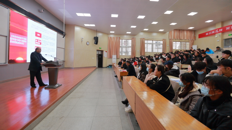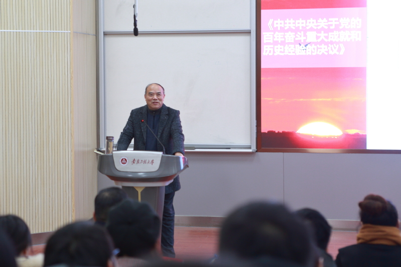 费为银紧紧围绕《中共中央关于党的百年奋斗重大成就和历史经验的决议》全面系统解读党的十九届六中全会精神,他强调要从十九届六中全会重大标志性成果角度,深刻认识百年奋斗重大成就和历史经验的重大意义、党的百年奋斗的初心使命和重大成就、中国特色社会主义新时代的历史性成就和历史性变革、党的百年奋斗的历史意义和历史经验,从党的百年奋斗历程中汲取智慧和力量,以优异成绩迎接党的二十大胜利召开。他要求全院师生学习贯彻习近平新时代中国特色社会主义思想,坚定“两个确立”,做到“两个维护”,继续在各项工作中保持良好的态势;他希望全体教师提高政治站位,立德树人,教书育人,争做“四有”好老师;全体学生加强政治理论学习,凝聚磅礴力量,创建优良学风,争做“五好”大学生。