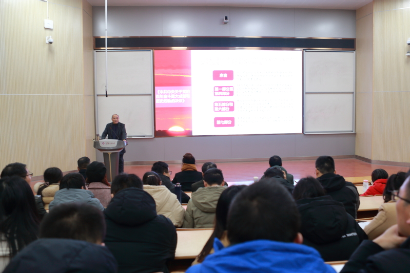 12月15日,校党委常委、副校长费为银在二教报告厅为数理与金融学院师生宣讲党的十九届六中全会精神,宣讲会由学院党委书记周毅仁主持。