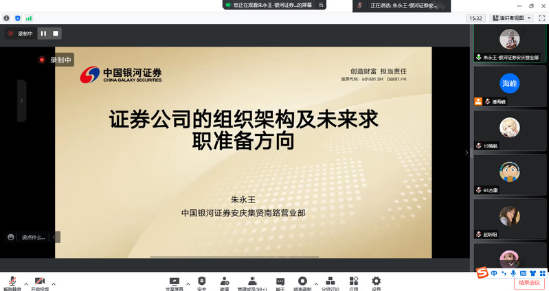 5月15日晚上,邀请了国内某大型公募基金公司总部固定收益部策略投资研究员、中央财经大学金融学博士曾懿亮,为同学们举办了主题为《资产管理行业介绍与职业发展路径规划》的讲座。为同学们就中国资管行业发展现状与远景、投资管理机构、资管行业岗位、职业晋升路径、资管行业的需求与待遇等进行了系统介绍,最后对学生的学习、生活、实习及职业发展提出了相关建议。