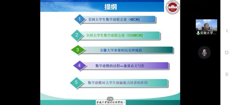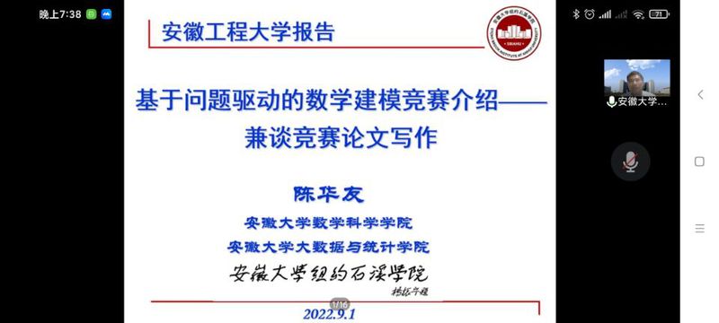 2022年9月1日晚,应数理与金融学院邀请,全国数学建模竞赛优秀指导老师、安徽省数学建模竞赛负责人、安徽大学纽约石溪学院副院长陈华友教授作了题为《基于问题驱动的数学建模竞赛介绍——兼谈竞赛论文写作》的线上辅导报告。学校全体2022年 “高教杯”全国大学生数学建模竞赛的参赛队员与指导老师参加了本次报告会,报告会由院长吴小太主持。