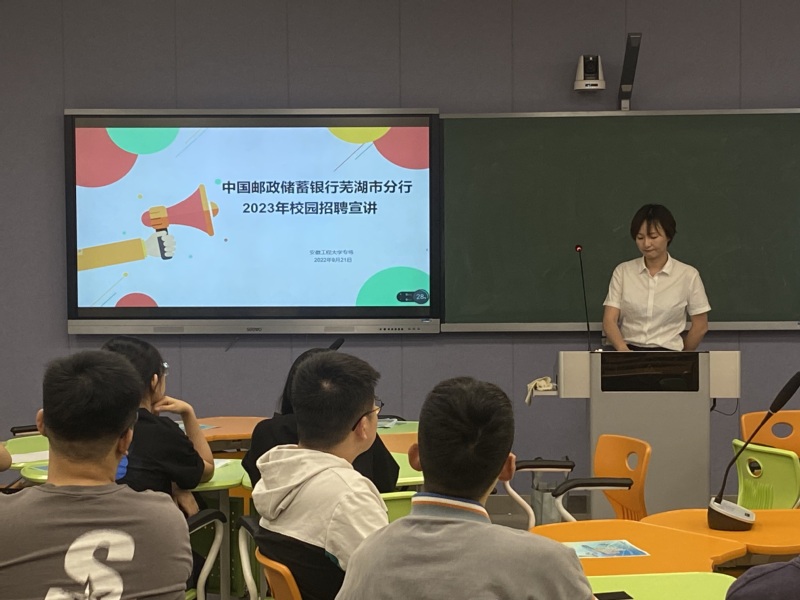 中国邮政储蓄银行芜湖市分行人力资源部负责人为在场学生做招聘介绍,围绕培训体系、职业发展、工作福利等方面详细介绍了邮储银行的特色和发展体系,同时就招聘流程和笔试、面试技巧为毕业生们做了详细讲解,展现出邮储的企业担当和人文关怀。宣讲会还邀请了我校优秀毕业生07届校友胡常胜和同学们分享了职业发展经验,以初入邮储的经历鼓励学生保持信心、勇于展现,以突破工作瓶颈的经历激励学生坚持初心、保持激情,为青年学生职业生涯规划提供思路。