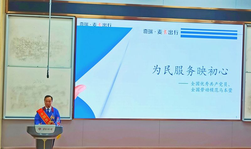 报告会上,马老师动情地讲述了一名共产党员为民服务、奉献社会的初心故事,他从敬业专注、同行战役、热心公益几个角度讲述了自己在平凡岗位上的不平凡人生故事,在工作中他是芜湖市第一个五星级出租车驾驶员,在疫情中主动承担最危险的应急运输保障任务,在生活中他热心送考、帮助盲童、公益宣讲、爱心募捐,将爱心和热心温暖到每一个人。马老师激励同学们做好新时代的接棒人,身处在一个伟大的时代,要积极投身到为实现中华民族伟大复兴的伟大征程中,在大学里铸造成为有善心、有爱心、热心公益、努力上进的青年一代,这样我们的国家才会有力量、有动力、有未来。报告会在马老师的《我的祖国》歌声和雷动的掌声中结束。
