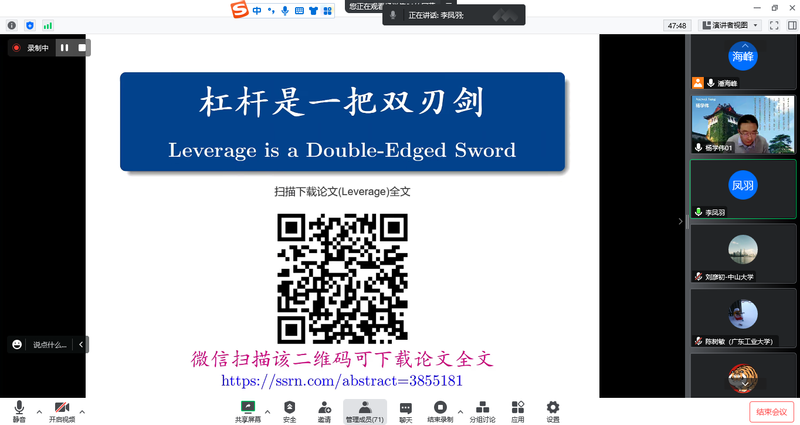 杨学伟教授做了题为《杠杆是一把双刃剑》的报告。利用期货市场账户级数据讨论了杠杆对投资绩效的影响。研究发现,高杠杆增加了投资组合的风险,同时降低了投资收益。利用监管变化进行的双重差分分析证实了这一定性结论。高杠杆带来的损失源于强制平仓以及由于杠杆增加而产生的额外交易成本。高杠杆放大了缺乏经验的投资者因处置效应和赌博偏好而造成的损失。另一方面,少数有经验的投资者通过积极择时和进行套利交易来利用杠杆;这些交易员每增加一单位杠杆,平均每天可赚取8个基点的额外回报。