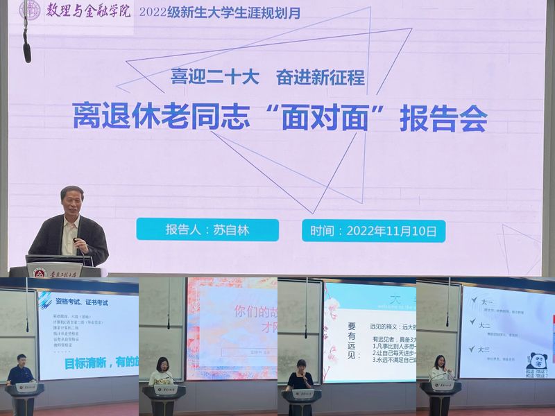 为更好帮助2022级学生完成角色转变、更好地认知大学、有效进行自我管理,激发成长内驱力,为大学生涯、职业生涯、人生成长打好基础,数理与金融学院积极响应和落实校团委关于《关于举办“喜迎二十大 筑梦启航行”2022级新生大学生涯规划月系列活动的通知》要求,通过开学第一课、6场主题班会、6场校友报告会、3场座谈会、1场学长学姐报告会、1场退休教师座谈会、系列大学生涯规划比赛,打好学院2022级学生大学生涯规划组合拳。