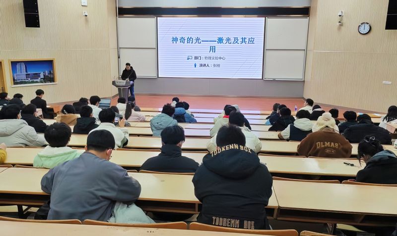 张刚老师从“什么是激光”“激光的未来发展是什么”“激光有什么应用”等几个问题切入主题,向同学们介绍了激光在人们的生活中扮演的角色,讲解了激光在生产生活的广泛应用,让在场的同学们了解激光的同时,感受到了激光技术的独特魅力。金融221班的冯浩东在上完课后激动地说:“我从小就对物理很感兴趣,这次报告会让我受益匪浅,很受张老师科研精神的感染,帮我打开了物理新世界的大门,以后我争取走进实验室,利用课余时间加深对科研知识的了解。”
