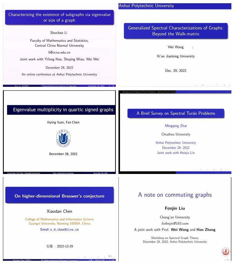 12月29日,数理与金融学院在线上举办了“图谱理论”专题系列报告会。华中师范大学博士生导师李书超教授、西安交通大学博士生导师王卫教授、上海大学博士生导师袁西英教授、滁州学院翟明清教授、广西大学陈小丹副教授、长安大学刘奋进副教授等做了专题报告。数理与金融学院院长吴小太,青年老师及研究生等参加了学术报告会。
