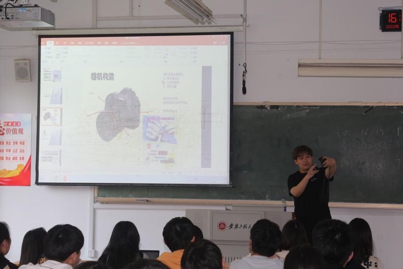 王周震同学曾获得RayBetApp官网下载 第二届“十佳学生记者”称号,他的作品最高点赞量30.6w,最高播放量800w。他向同学们分享了摄影、视频拍摄的经验,围绕相机曝光三要素、常用构图方式、视频帧率以及如何拍大片进行了详细讲解。他以自身的创作经历,激励大家在实践中总结经验,不断提高自己的拍摄和剪辑能力。