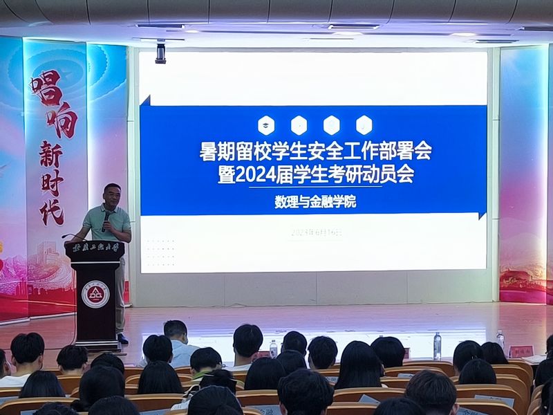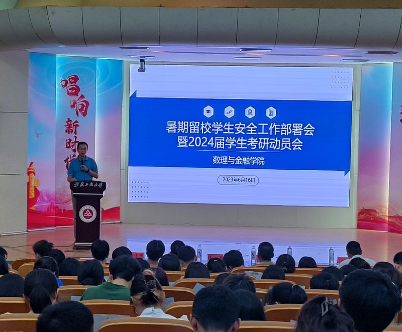 为切实加强暑期留校学生安全教育和管理,增强留校学生安全防范意识,做好2024届学生考研指导和动员,6月16日,数理与金融学院在学术报告厅召开暑期留校学生安全工作部署会暨2024届学生考研动员会。学院党委书记周毅仁,党委副书记、院长吴小太,副院长张培雨,副院长潘海峰,相关辅导员以及全体暑期留校本科生和研究生参加会议。会议由学院党委副书记、纪委书记何志恒主持。