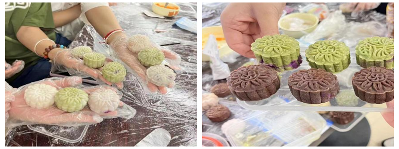 一会儿功夫,一块块独特并充满心意的月饼在大家动手合作中完成了,大家看着自己亲手制作的月饼充满了喜悦感和成就感。
