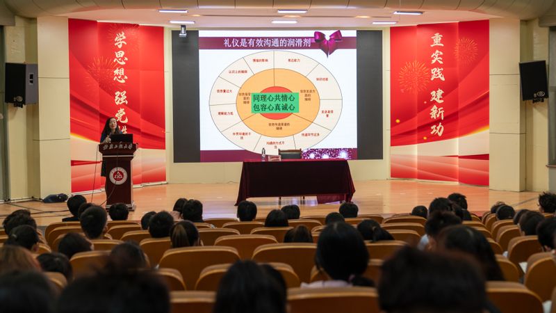 恭而无礼则劳,慎而无礼则葸。闫石从人际交往沟通的“两个70%”引出“礼”的重要性,向同学们讲解了面部表情、坐姿、站立等礼仪知识,与同学们进行互动交流,指出礼仪有助于提升个人气质,希望同学们更加懂文明懂礼仪,更好的适应社会、走进社会。