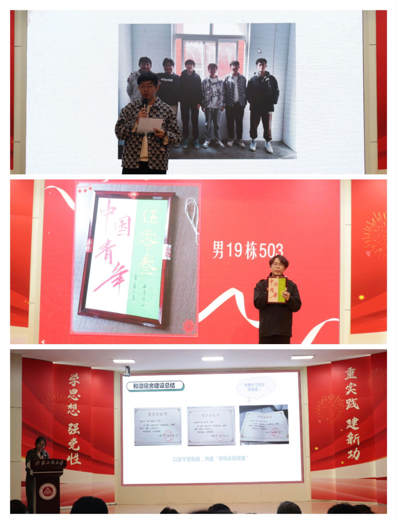 表彰会上,首先公布了学院2023-2024学年第一学期宿舍分级评议结果,张开炳为“王者宿舍”代表颁发门牌,并为21级学生宿舍功能型党支部授牌。随后参会老师依次为在宿舍门牌设计大赛、新生宿舍对抗赛、“面对镜头,你就是superstar”宿舍拍大片、一封家书等赛事中获得表彰的学生及宿舍代表颁奖。榜样的力量是无穷的,希望同学们汲取榜样的力量,携手共建和谐宿舍,将宿舍打造成为更温馨的家。