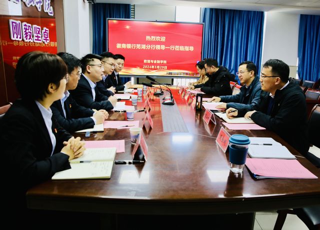 3月29日上午,徽商银行芜湖分行党委组织部部长陶翼一行来数理与金融学院就校企合作进行研讨交流。学院党委副书记、院长吴小太,党委委员、副院长潘海峰,副院长张培雨,党委委员、金融教师党支部书记周金明,金融研究生党支部书记魏晴晴参加。