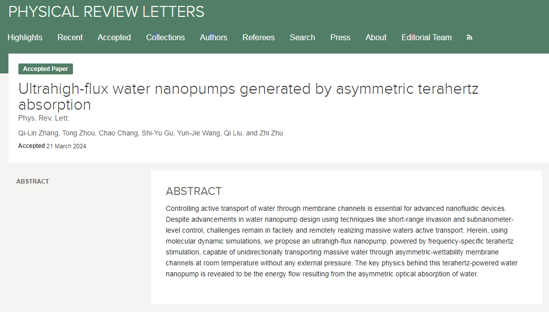 近日,我校数理与金融学院章其林课题组在纳米水泵领域取得突破性进展,相关成果以“Ultrahigh-Flux Water Nanopumps Generated by Asymmetric Terahertz Absorption”为题发表在国际顶级期刊《Physical Review Letters》上,这也是RayBetApp官网下载 以第一单位发表在PRL上的研究成果。章其林副教授为论文第一作者,我校材料科学与工程学院刘琪教授,北京大学常超研究员以及上海理工大学朱智副教授为共同通讯作者。