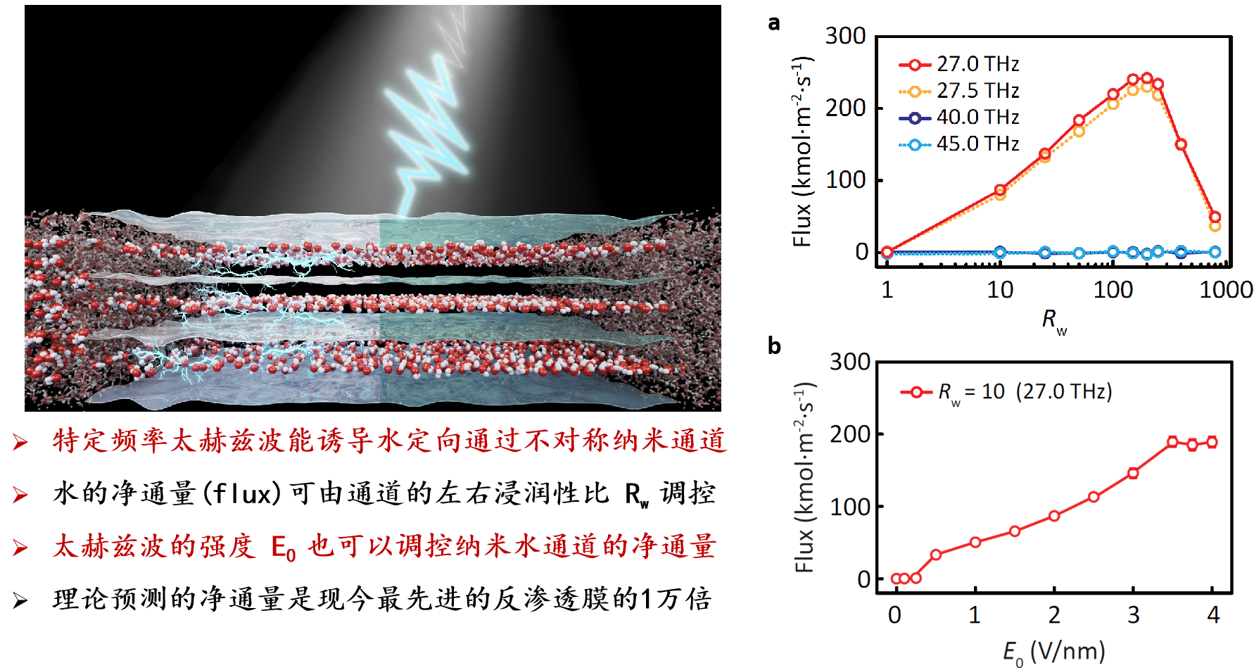 在纳米世界里,操控大规模水单向传输是一个巨大挑战,这是因为水分子是电中性且无磁矩,电场或磁场都无法驱动其单向流通。基于课题组前期研究成果[Phys. Rev. Lett. 110, 254501 (2013);Nanoscale 8,1886(2016);Phys.Rev.Fluids 7,114202(2022)]和生物主动输运机制的启示,在本研究中,团队成员通过模拟太赫兹频率的光辐照到左右不对称的二维纳米水通道上,发现特定频率的太赫兹辐照能诱导通道内受限水单向流通,其最大水通量能达到先进反渗透膜的1万倍左右。该工作开辟了太赫兹技术调控实现泵水通过纳米通道的新路径,首次提出“太赫兹光的不对称吸收引起能量流”这一光控水输运的物理机制。由于太赫兹波具有长程可控、高效无损和生物兼容等优点,该太赫兹供能的棘轮式分子泵机制不仅有望能应用在生物医学和过滤膜领域,帮助实现水和离子在生物/纳米通道中的高效精准输运,同时也能进一步拓展太赫兹技术在过滤、脱盐、蒸发、能量转换和生物调控等领域的综合应用。研究工作得到了国家自然科学基金、安徽高校自然科学研究重点项目,以及芜湖市科技项目的资助。