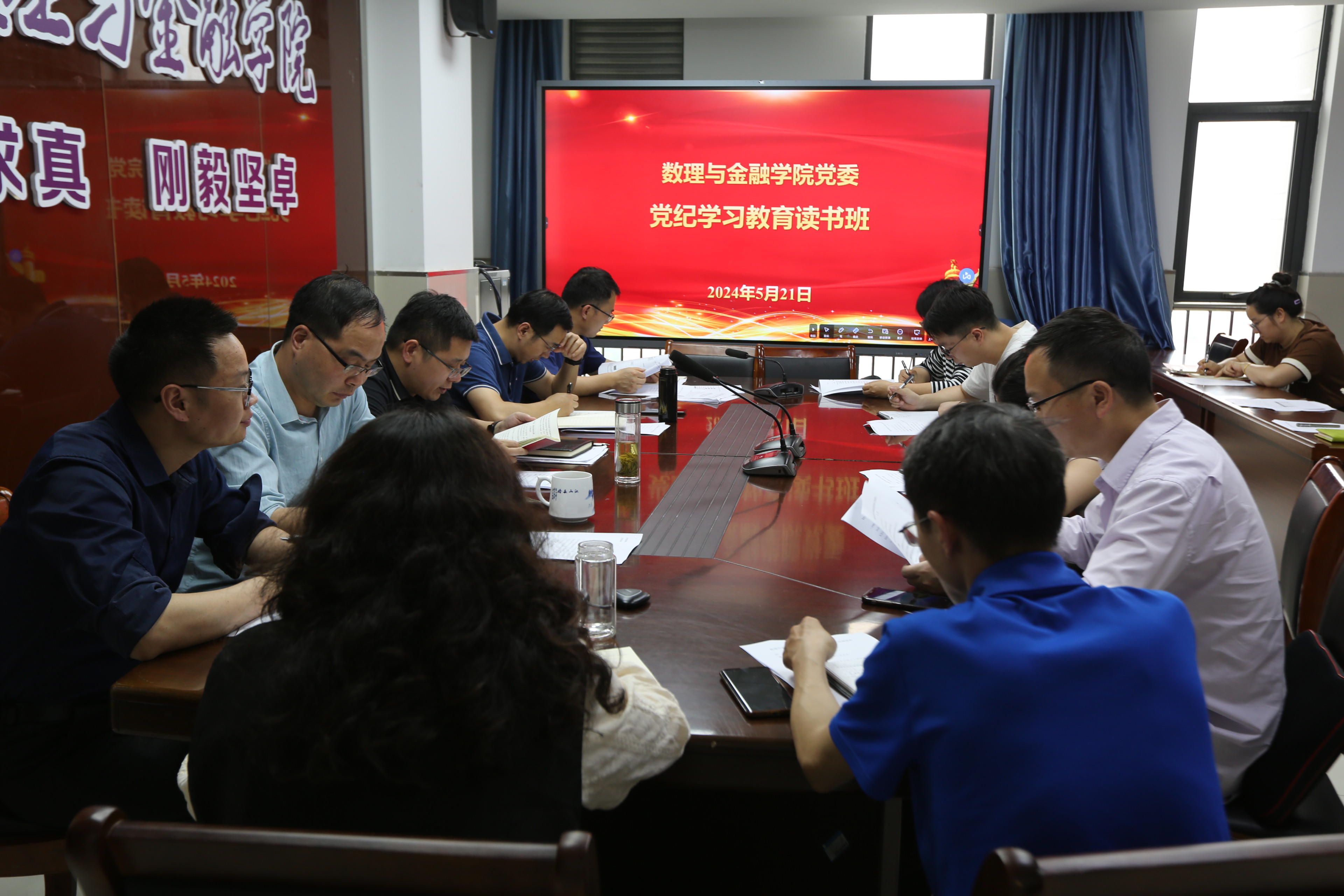 5月21日,数理与金融学院党委党纪学习教育读书班在学院会议室组织集中学习。与会人员共同学习了《中国共产党纪律处分条例》第七章内容,学院党委书记林煦东分享了学习体会。