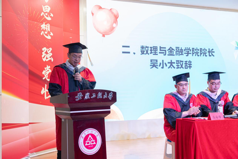 典礼上,学院教师代表金融工程系主任周金明,毕业生代表统计201班叶译雯和金融研21班徐玥,家长代表金融203陈艾璐父亲分别发言;表彰了2024届安徽省优秀毕业生和校优秀毕业生。