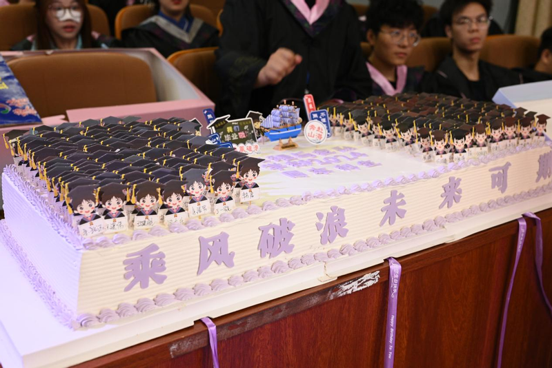 毕业典礼结束后,辅导员汤建文、魏晴晴带领毕业生共同观看文艺表演,参加令人激动的抽奖活动,共同分享着属于他们的毕业蛋糕,享受着离校前的快乐时光,每一帧每一秒都是值得纪念的美好瞬间。